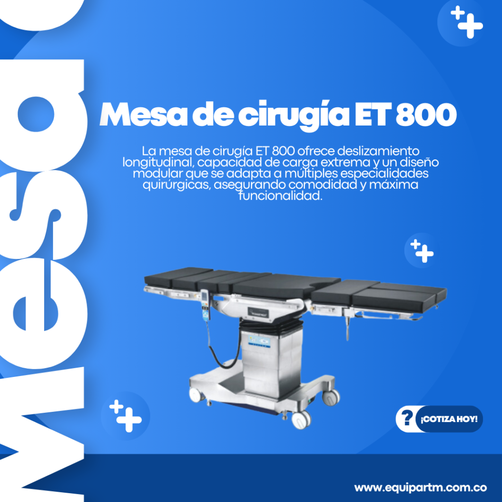 La mesa de cirugía ET 800 ofrece deslizamiento longitudinal, capacidad de carga extrema y un diseño modular que se adapta a múltiples especialidades quirúrgicas, asegurando comodidad y máxima funcionalidad.