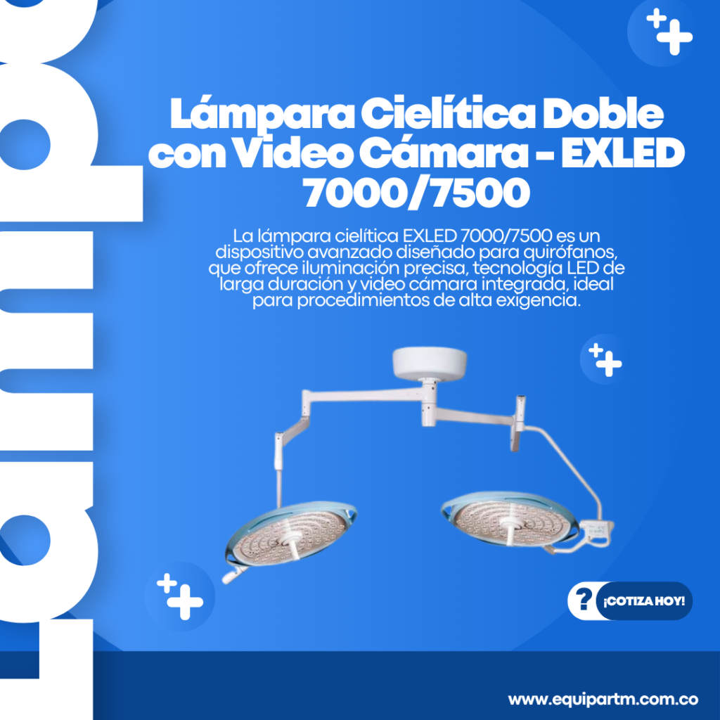 La lámpara cielítica EXLED 7000/7500 es un dispositivo avanzado diseñado para quirófanos, que ofrece iluminación precisa, tecnología LED de larga duración y video cámara integrada, ideal para procedimientos de alta exigencia.