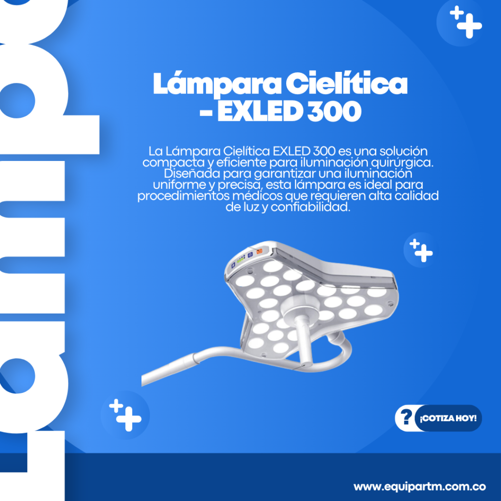 La Lámpara Cielítica EXLED 300 es una solución compacta y eficiente para iluminación quirúrgica. Diseñada para garantizar una iluminación uniforme y precisa, esta lámpara es ideal para procedimientos médicos que requieren alta calidad de luz y confiabilidad.