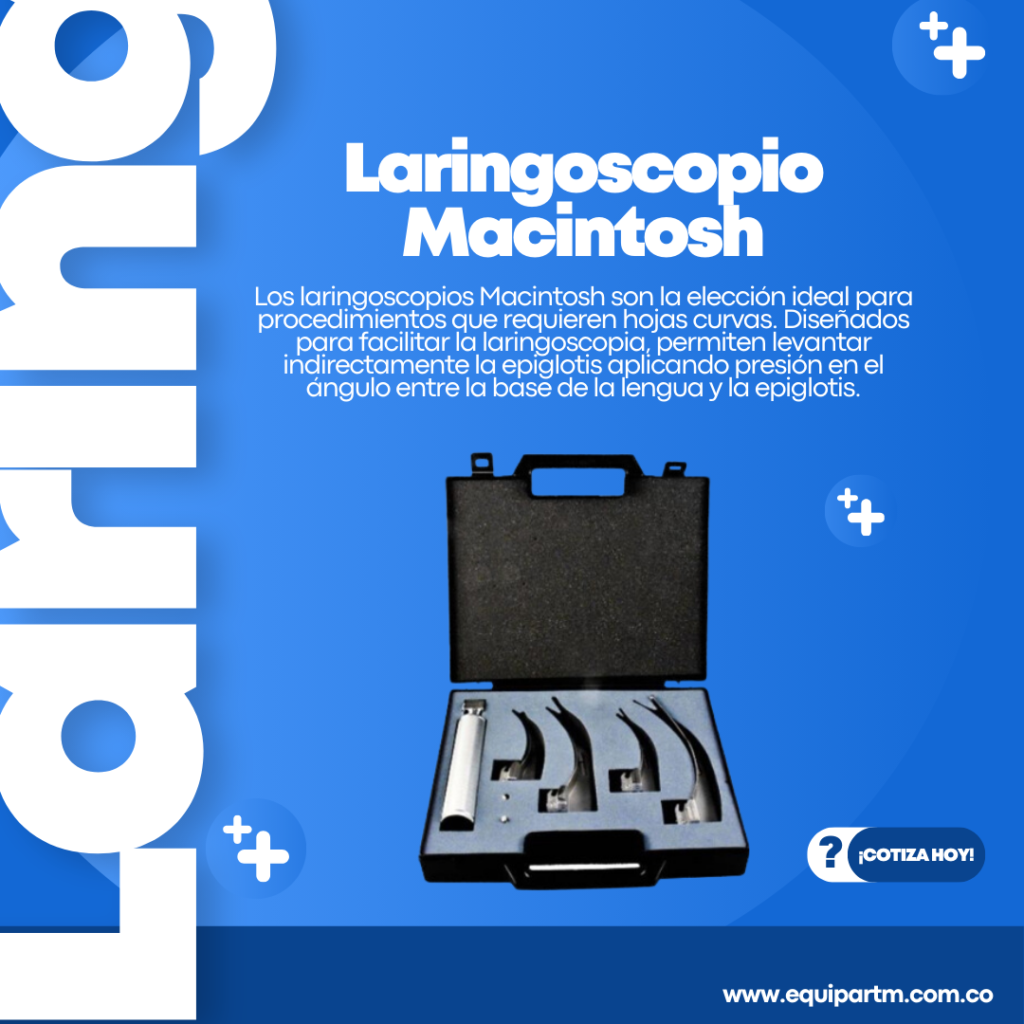 Los laringoscopios Macintosh son la elección ideal para procedimientos que requieren hojas curvas. Diseñados para facilitar la laringoscopia, permiten levantar indirectamente la epiglotis aplicando presión en el ángulo entre la base de la lengua y la epiglotis.
