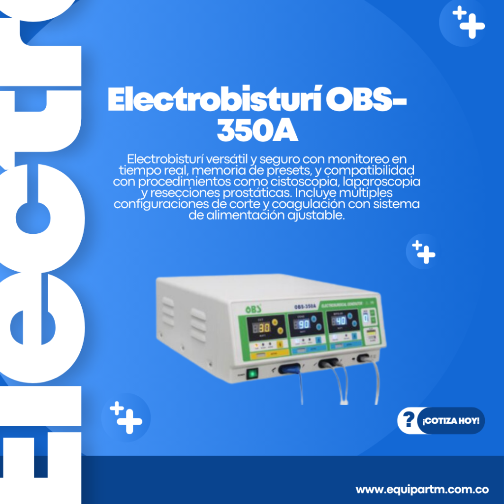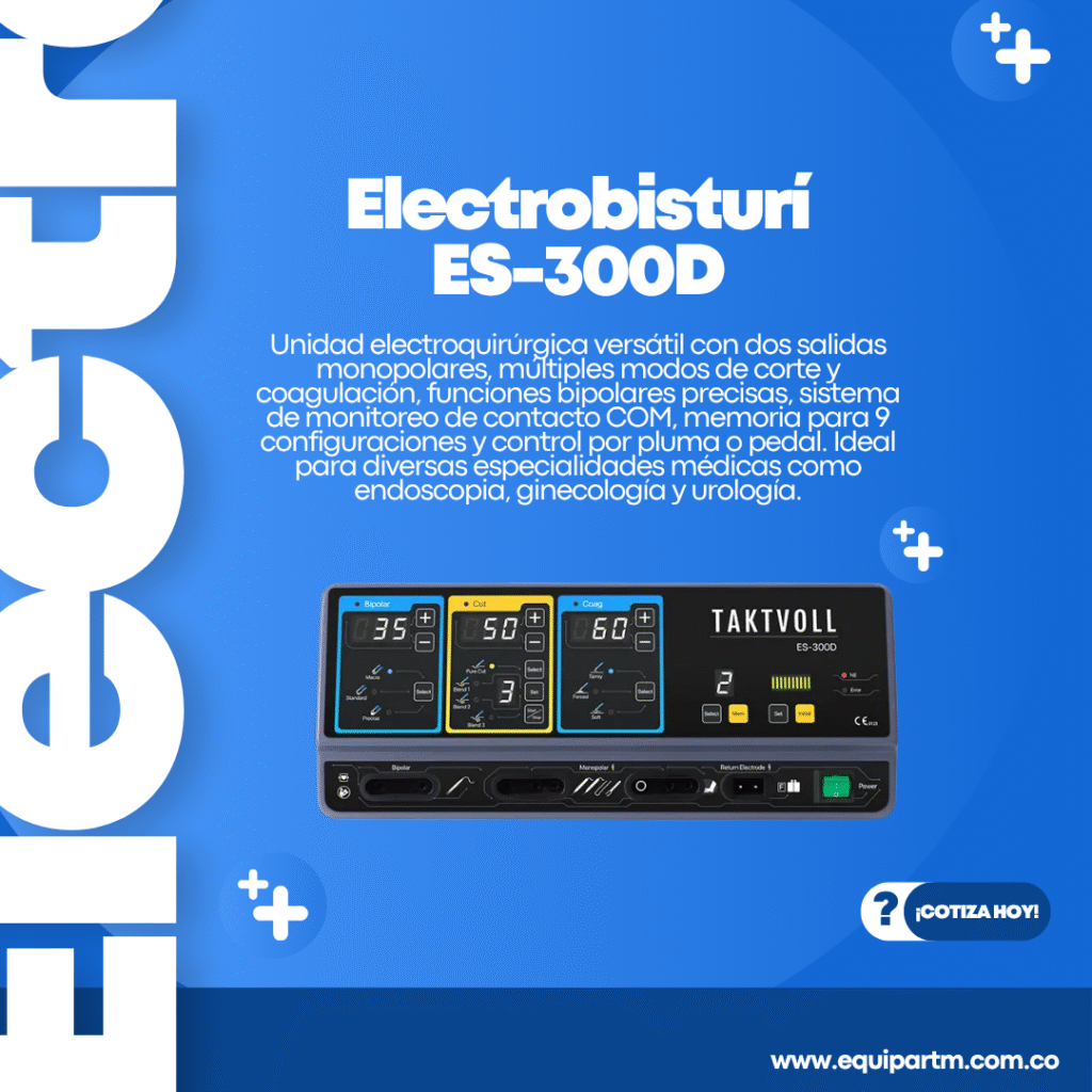 Electrobisturí versátil y seguro con monitoreo en tiempo real, memoria de presets, y compatibilidad con procedimientos como cistoscopia, laparoscopia y resecciones prostáticas. Incluye múltiples configuraciones de corte y coagulación con sistema de alimentación ajustable.
