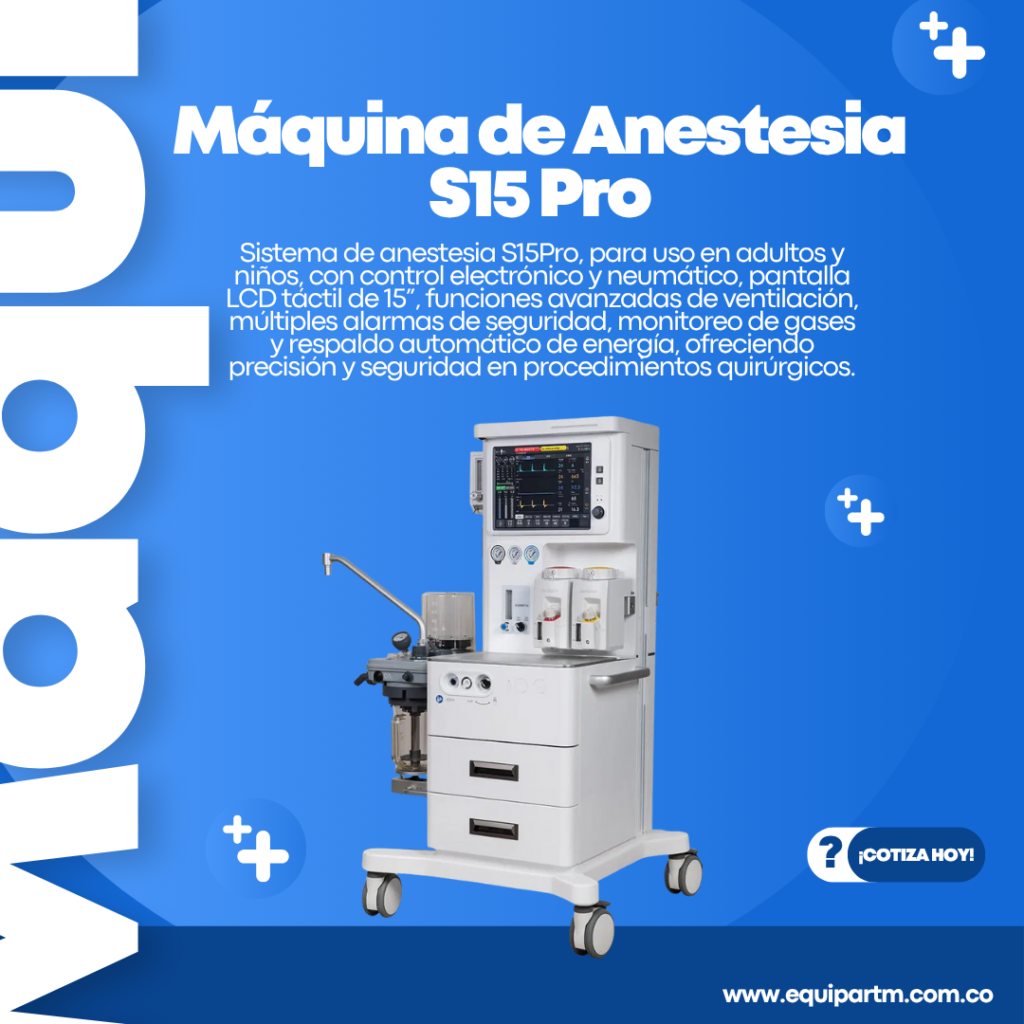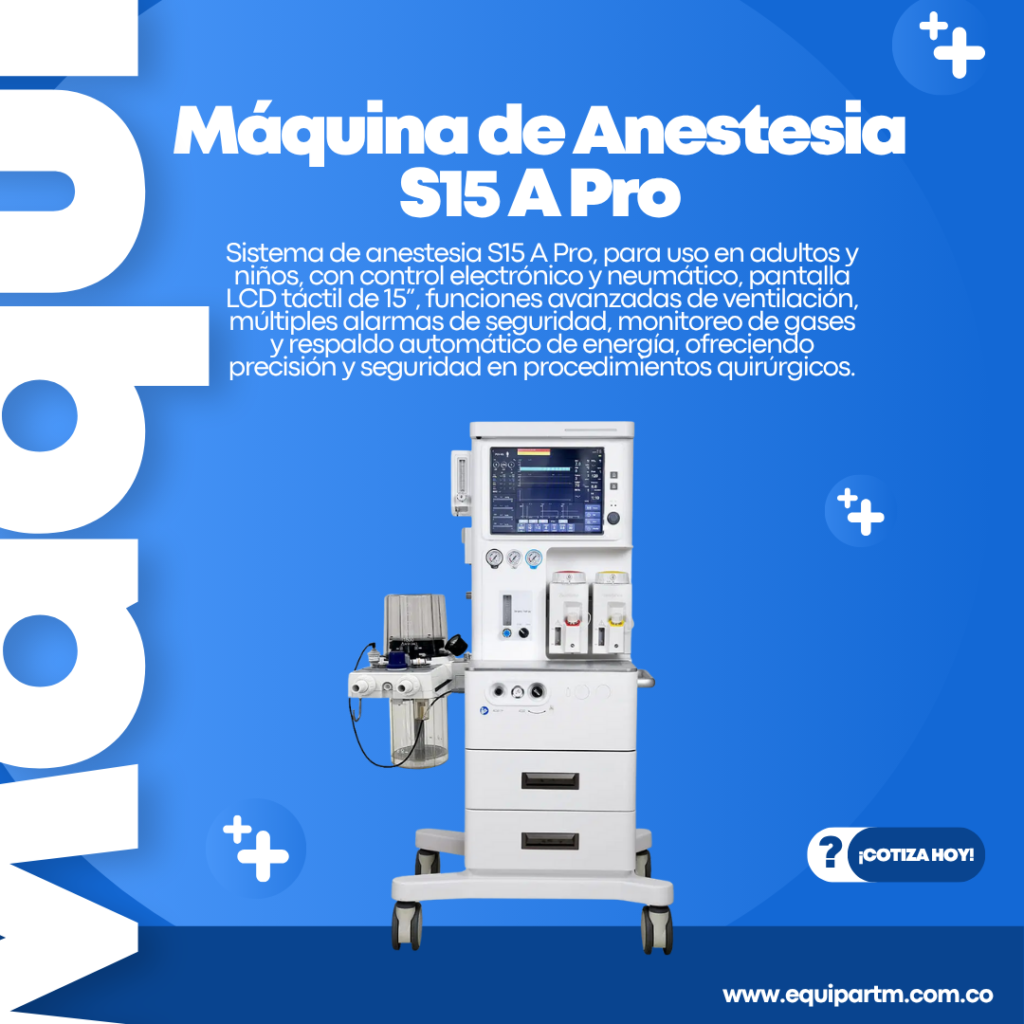 Sistema de anestesia S15APro, diseñado para adultos y niños, con control electrónico y neumático, pantalla LCD táctil de 15”, funciones avanzadas de ventilación, alarmas de seguridad, monitoreo de gases y respaldo automático de energía, garantizando precisión, seguridad y eficiencia en quirófano.