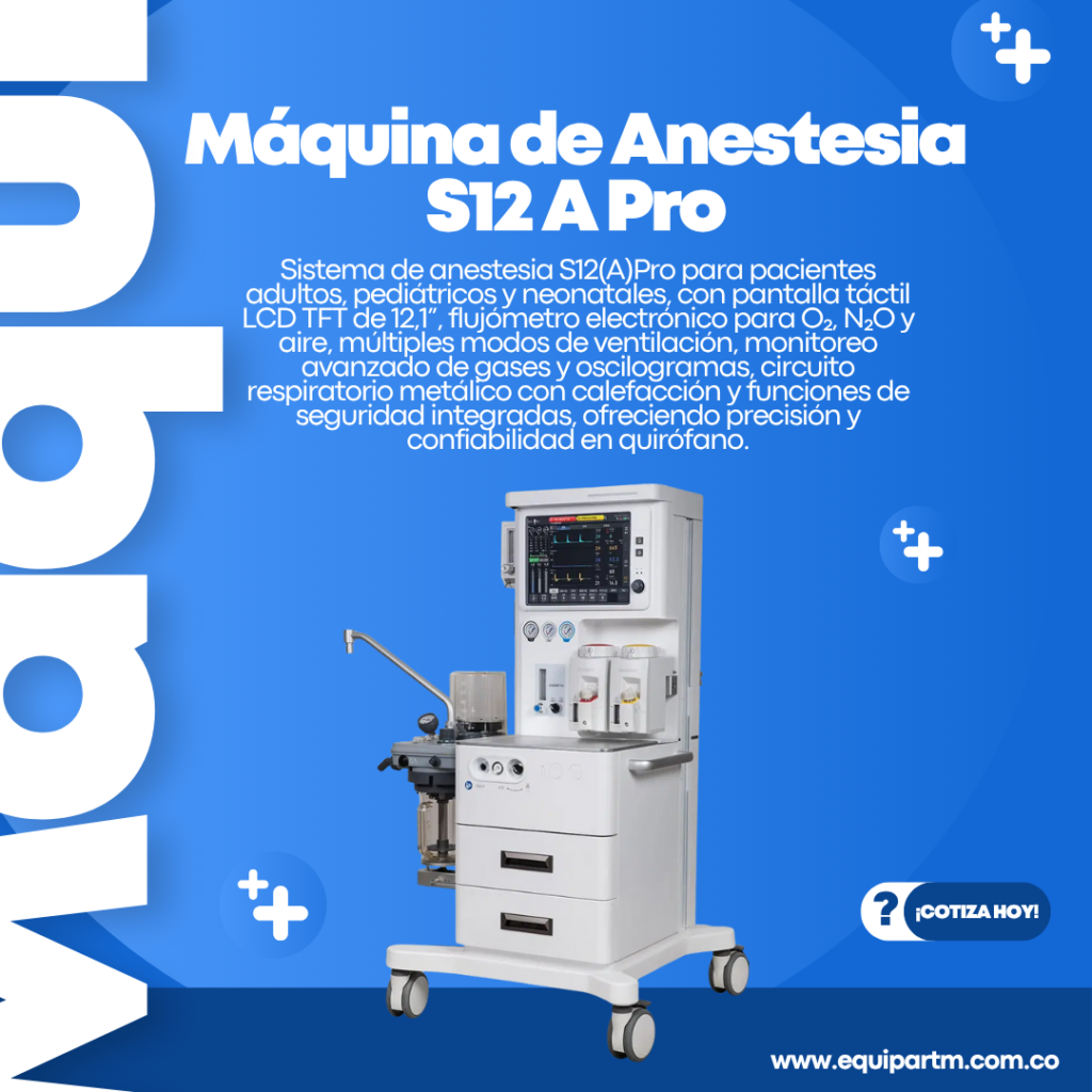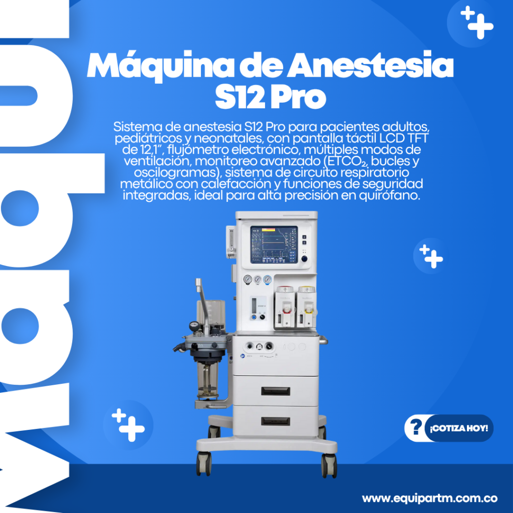 Sistema de anestesia S12(A)Pro para pacientes adultos, pediátricos y neonatales, con pantalla táctil LCD TFT de 12,1”, flujómetro electrónico para O₂, N₂O y aire, múltiples modos de ventilación, monitoreo avanzado de gases y oscilogramas, circuito respiratorio metálico con calefacción y funciones de seguridad integradas, ofreciendo precisión y confiabilidad en quirófano.