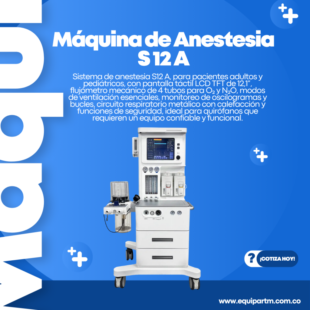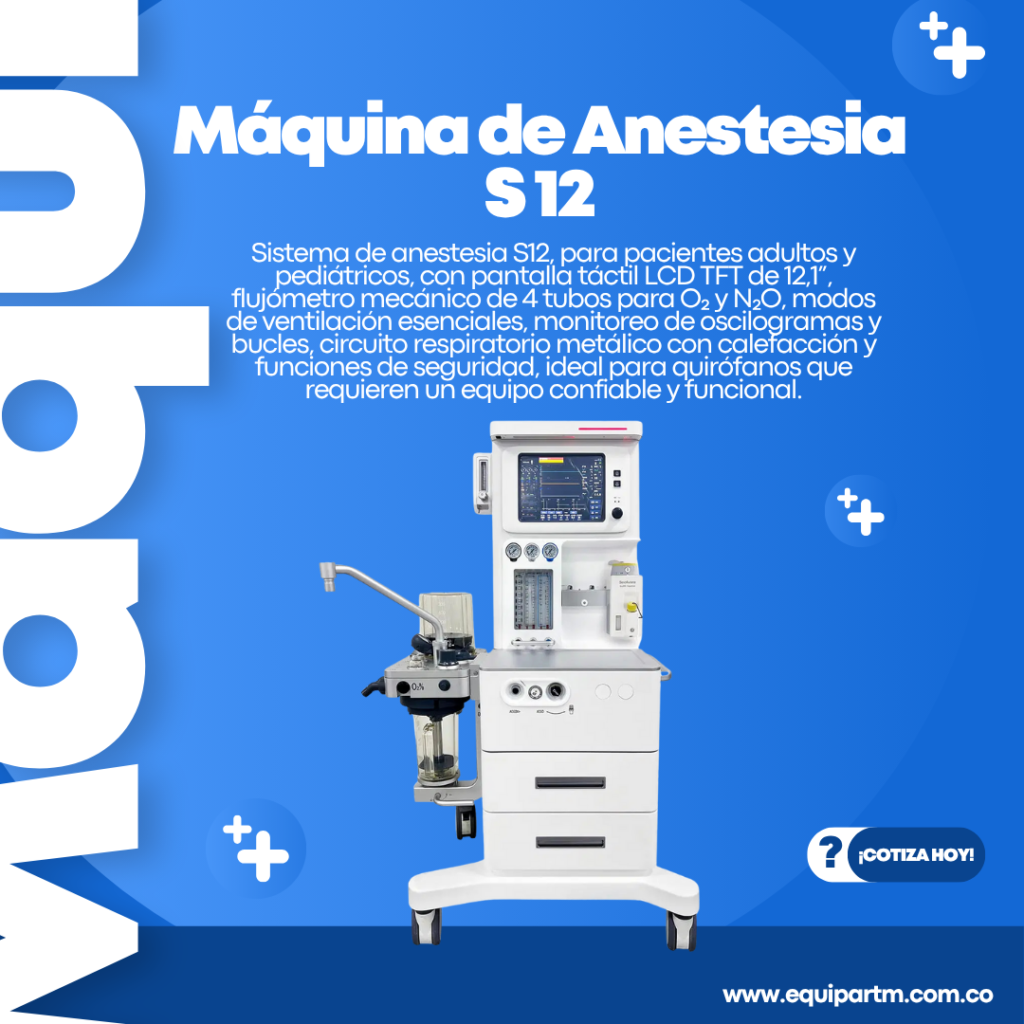 Sistema de anestesia S12 A, para pacientes adultos y pediátricos, con pantalla táctil LCD TFT de 12,1”, flujómetro mecánico de 4 tubos para O₂ y N₂O, modos de ventilación esenciales, monitoreo de oscilogramas y bucles, circuito respiratorio metálico con calefacción y funciones de seguridad, ideal para quirófanos que requieren un equipo confiable y funcional.