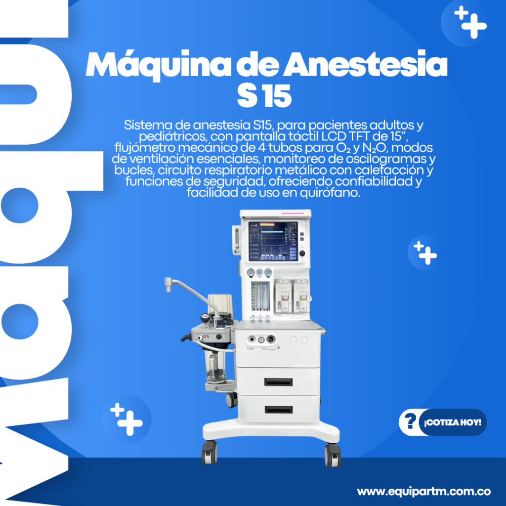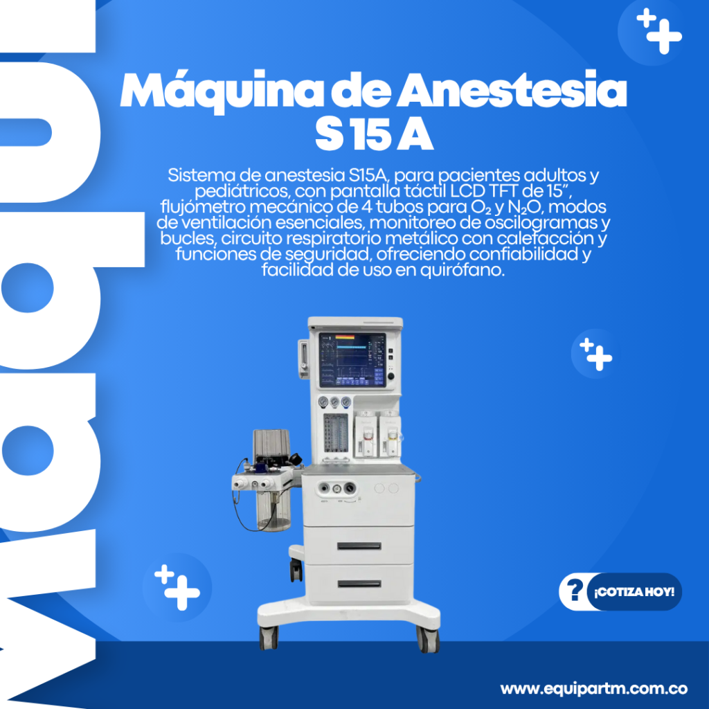 Sistema de anestesia S15 A, para pacientes adultos y pediátricos, con pantalla táctil LCD TFT de 15”, flujómetro mecánico de 4 tubos para O₂ y N₂O, modos de ventilación esenciales, monitoreo de oscilogramas y bucles, circuito respiratorio metálico con calefacción y funciones de seguridad, ofreciendo confiabilidad y facilidad de uso en quirófano.