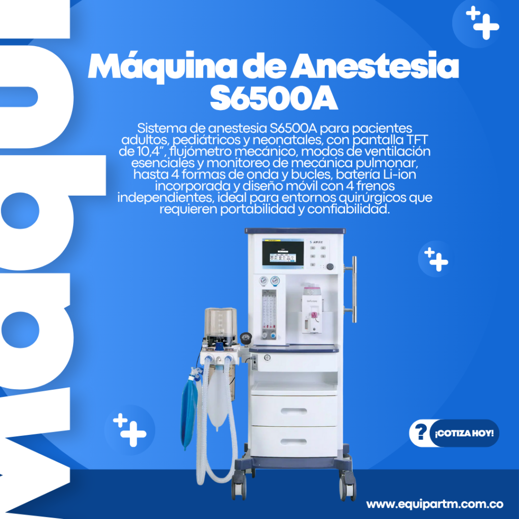 Sistema de anestesia S6500A para pacientes adultos, pediátricos y neonatales, con pantalla TFT de 10,4”, flujómetro mecánico, modos de ventilación esenciales y monitoreo de mecánica pulmonar, hasta 4 formas de onda y bucles, batería Li-ion incorporada y diseño móvil con 4 frenos independientes, ideal para entornos quirúrgicos que requieren portabilidad y confiabilidad.