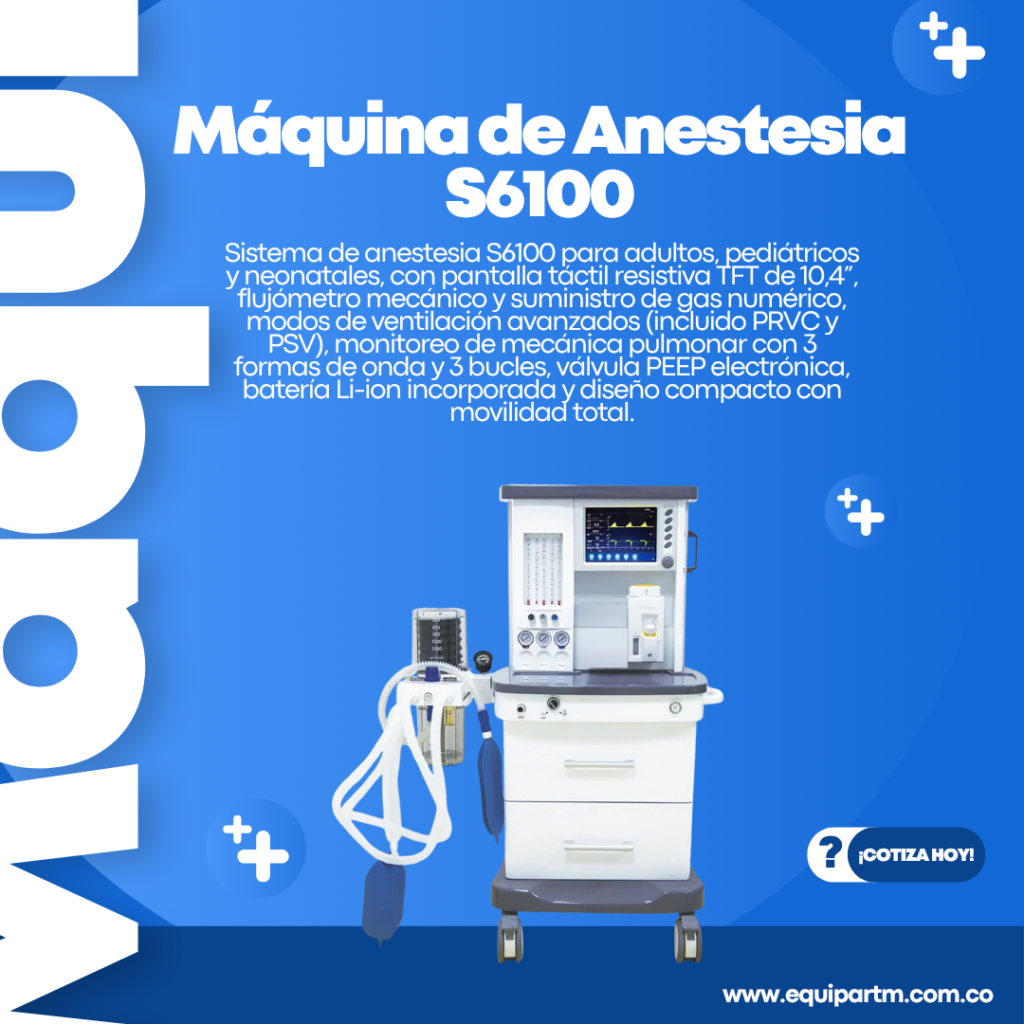 Sistema de anestesia S6100 para adultos, pediátricos y neonatales, con pantalla táctil resistiva TFT de 10,4”, flujómetro mecánico y suministro de gas numérico, modos de ventilación avanzados (incluido PRVC y PSV), monitoreo de mecánica pulmonar con 3 formas de onda y 3 bucles, válvula PEEP electrónica, batería Li-ion incorporada y diseño compacto con movilidad total.
