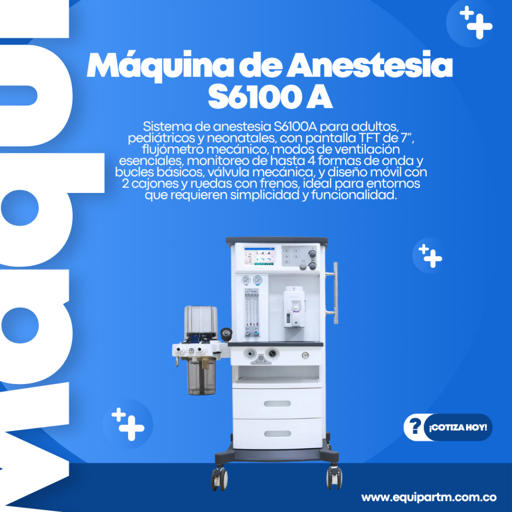 Sistema de anestesia S6100A para adultos, pediátricos y neonatales, con pantalla TFT de 7”, flujómetro mecánico, modos de ventilación esenciales, monitoreo de hasta 4 formas de onda y bucles básicos, válvula mecánica, y diseño móvil con 2 cajones y ruedas con frenos, ideal para entornos que requieren simplicidad y funcionalidad.