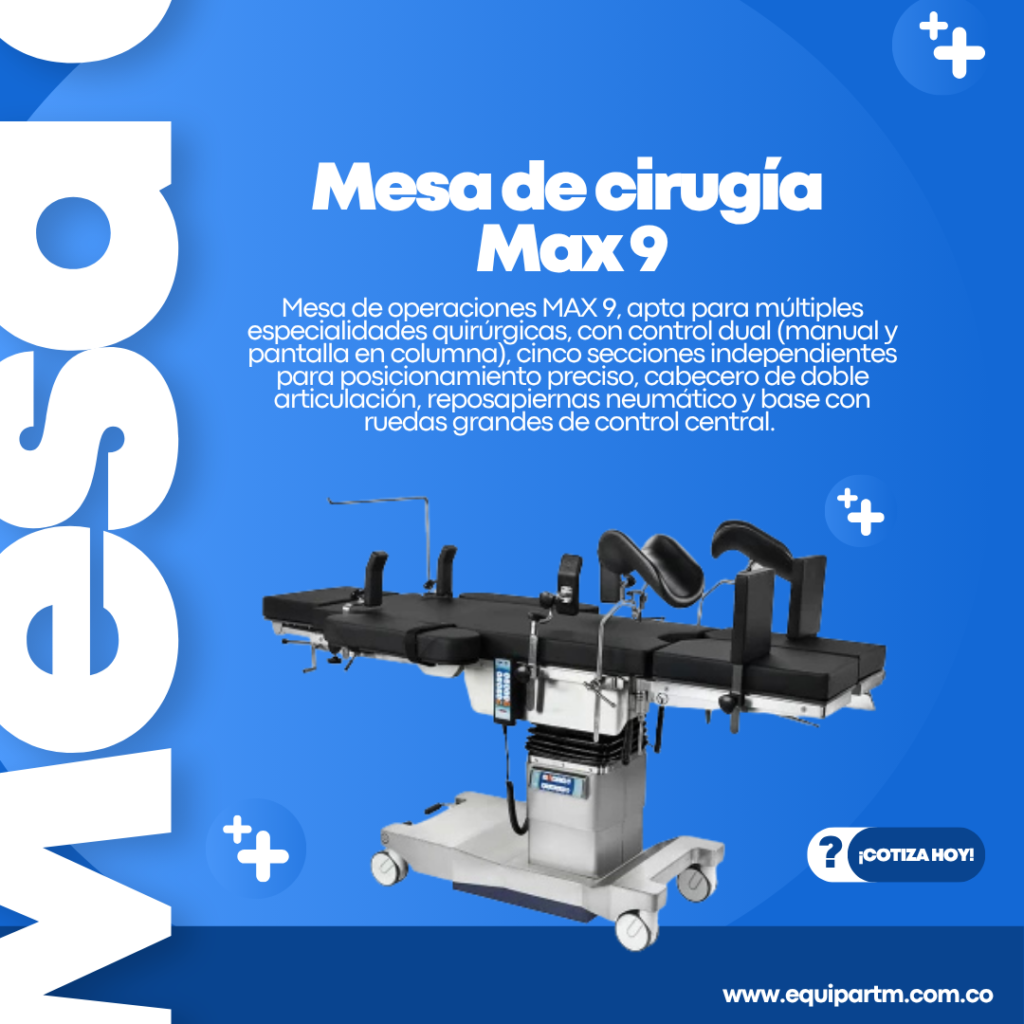 Mesa de operaciones MAX 9, apta para múltiples especialidades quirúrgicas, con control dual (manual y pantalla en columna), cinco secciones independientes para posicionamiento preciso, cabecero de doble articulación, reposa piernas neumático y base con ruedas grandes de control central.
