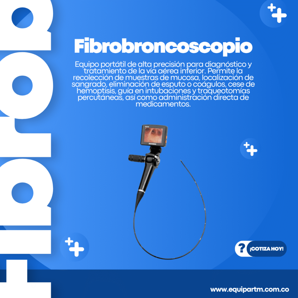 Equipo portátil de alta precisión para diagnóstico y tratamiento de la vía aérea inferior. Permite la recolección de muestras de mucosa, localización de sangrado, eliminación de esputo o coágulos, cese de hemoptisis, guía en intubaciones y traqueotomías percutáneas, así como administración directa de medicamentos.