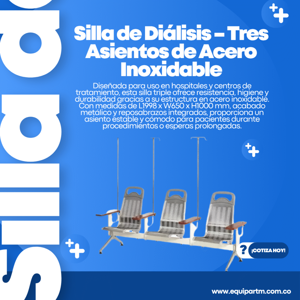 Diseñada para uso en hospitales y centros de tratamiento, esta silla triple ofrece resistencia, higiene y durabilidad gracias a su estructura en acero inoxidable. Con medidas de L1998 x W650 x H1000 mm, acabado metálico y reposabrazos integrados, proporciona un asiento estable y cómodo para pacientes durante procedimientos o esperas prolongadas.