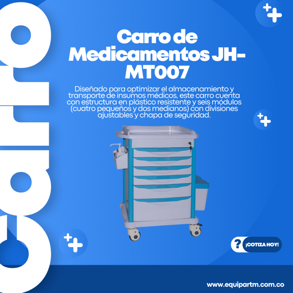 Equipo hospitalario diseñado para el almacenamiento, organización y transporte de insumos, medicamentos y material médico dentro de las diferentes áreas clínicas.