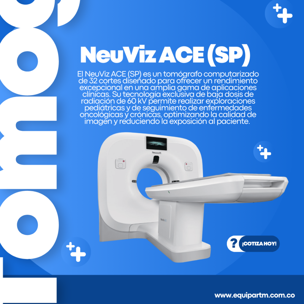 El NeuViz ACE (SP) es un tomógrafo computarizado de 32 cortes diseñado para ofrecer un rendimiento excepcional en una amplia gama de aplicaciones clínicas. Su tecnología exclusiva de baja dosis de radiación de 60 kV permite realizar exploraciones pediátricas y de seguimiento de enfermedades oncológicas y crónicas, optimizando la calidad de imagen y reduciendo la exposición al paciente.