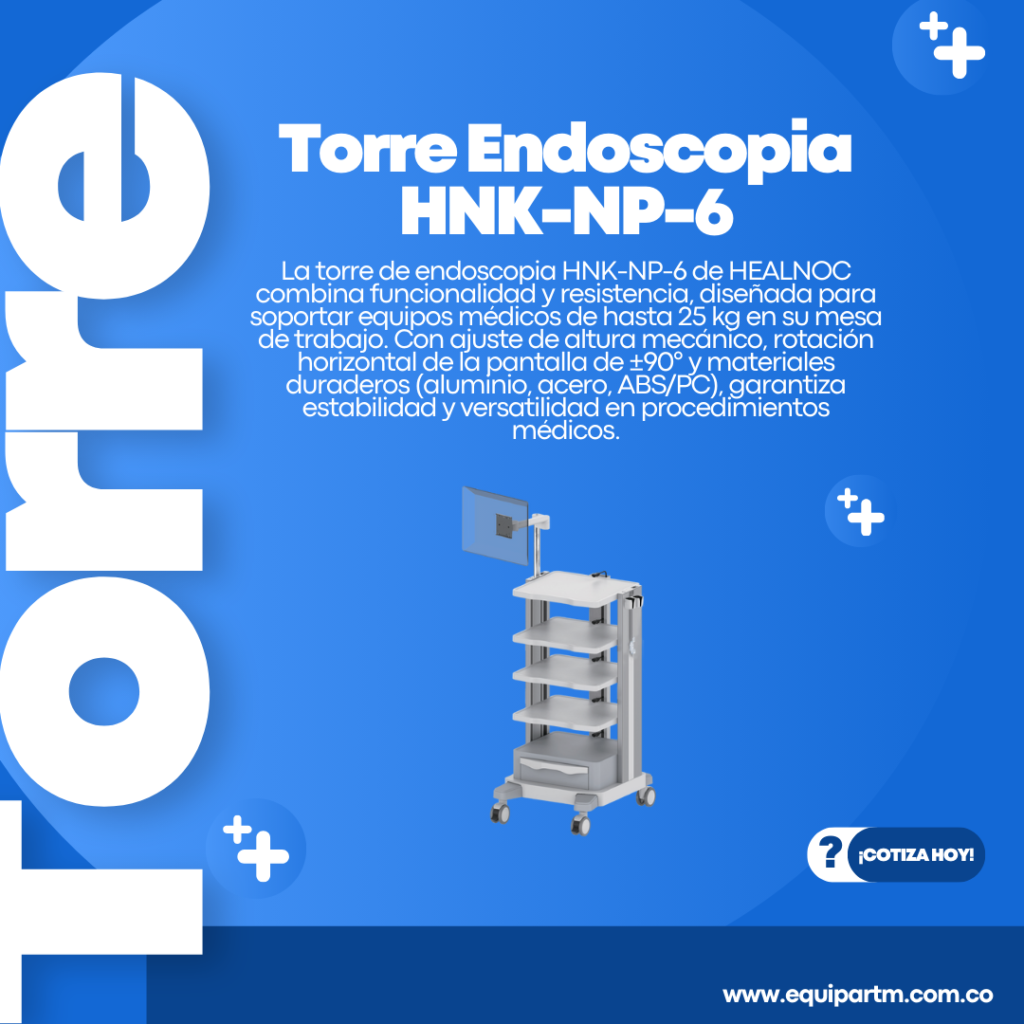 La torre de endoscopia HNK-NP-6 de HEALNOC combina funcionalidad y resistencia, diseñada para soportar equipos médicos de hasta 25 kg en su mesa de trabajo. Con ajuste de altura mecánico, rotación horizontal de la pantalla de ±90° y materiales duraderos (aluminio, acero, ABS/PC), garantiza estabilidad y versatilidad en procedimientos médicos.
