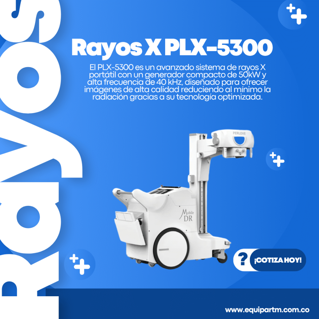 El PLX-5300 es un avanzado sistema de rayos X portátil con un generador compacto de 50kW y alta frecuencia de 40 kHz, diseñado para ofrecer imágenes de alta calidad reduciendo al mínimo la radiación gracias a su tecnología optimizada.
