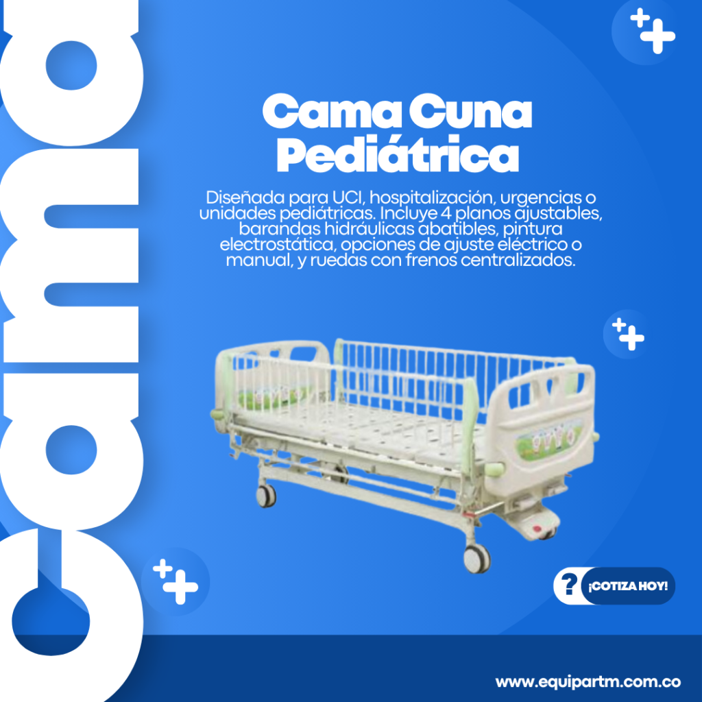 Cuna pediátrica de cuatro planos con elevación eléctrica o manual de cabecero, pieceros y altura, barandas laterales abatibles hidráulicas y ruedas con freno central o individual, diseñada para hospitalización, urgencias y unidades pediátricas. Su construcción en materiales resistentes y pintura electrostática garantiza seguridad y durabilidad, combinando comodidad y versatilidad para el manejo clínico diario.