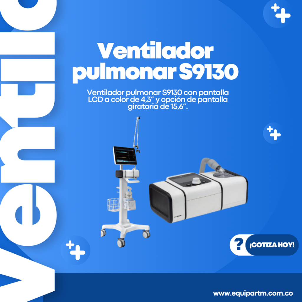 Ventilador pulmonar S9130 con pantalla LCD a color de 4,3” y opción de pantalla giratoria de 15,6”. Múltiples modos de trabajo, diseño ergonómico y silencioso, fácil manejo, batería integrada y humidificador médico para mayor confort del paciente.