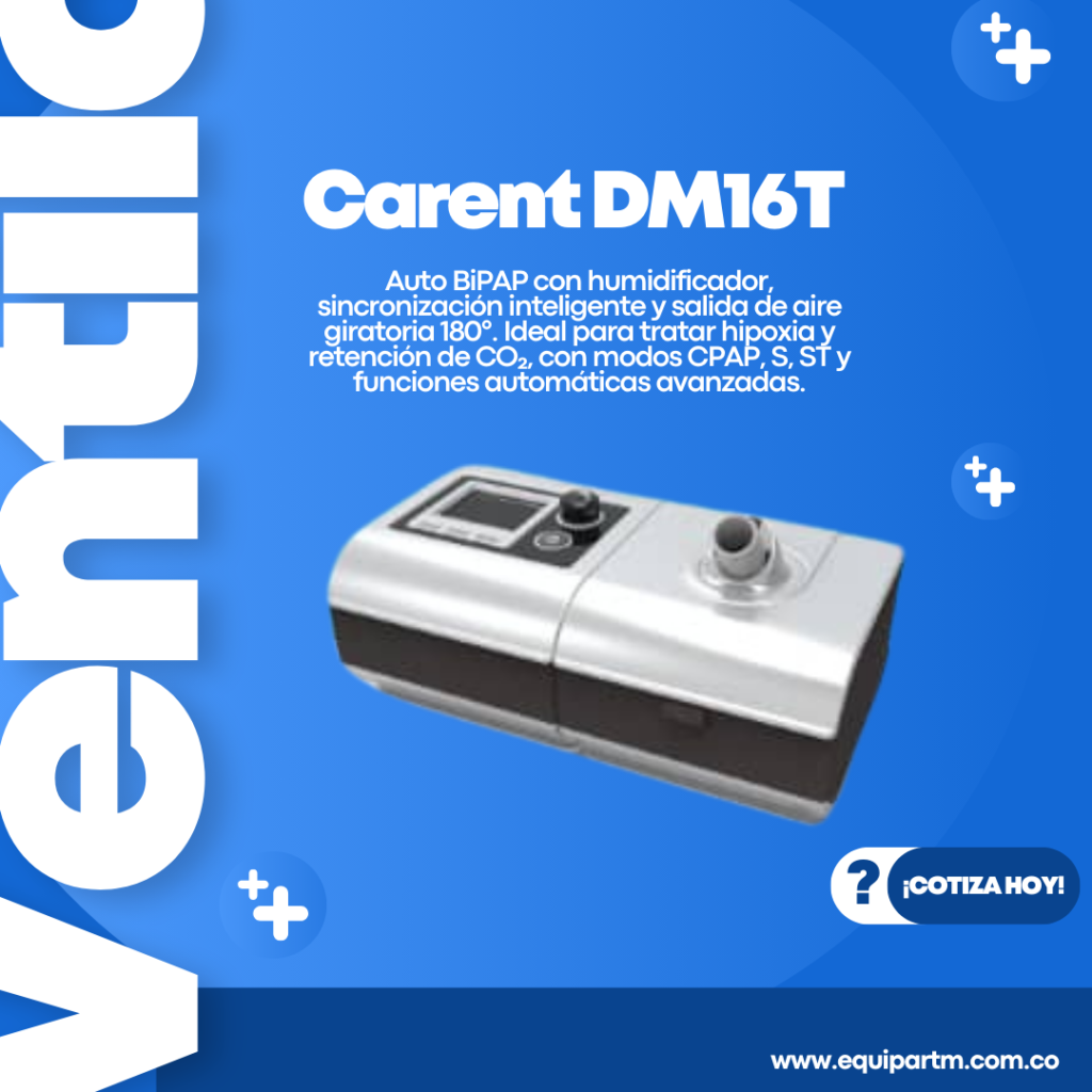 El Carent DM16T es una máquina Auto BiPAP con humidificador diseñada para mejorar la ventilación del usuario de forma segura y efectiva. Gracias a su avanzada tecnología, alivia los síntomas de hipoxia y retención de dióxido de carbono, logrando una óptima sincronización entre el paciente y el equipo.
