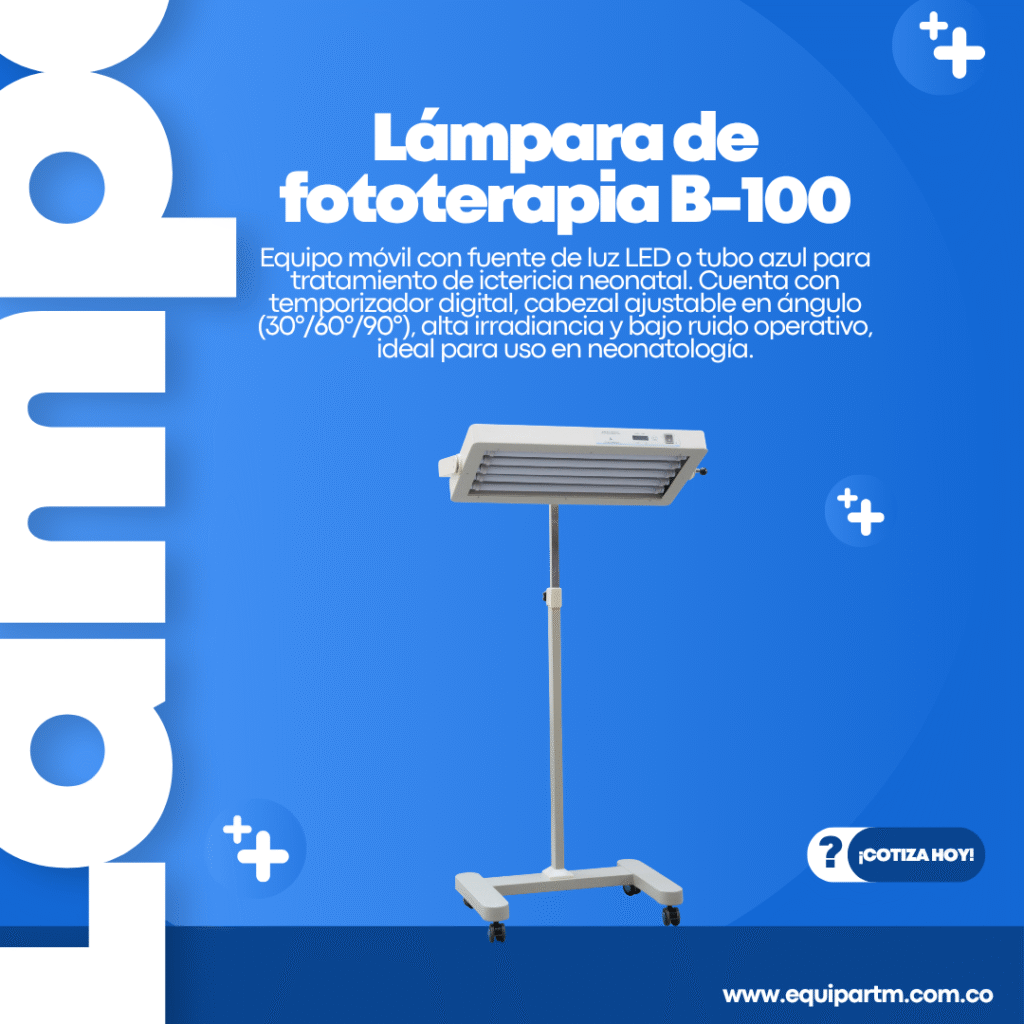 Equipo móvil con fuente de luz LED o tubo azul para tratamiento de ictericia neonatal. Cuenta con temporizador digital, cabezal ajustable en ángulo (30°/60°/90°), alta irradiancia y bajo ruido operativo, ideal para uso en neonatología.
