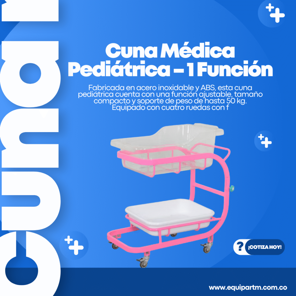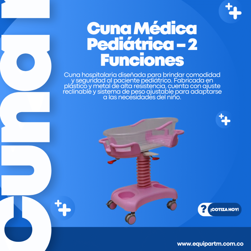 Cuna pediátrica con dos funciones, construida en plástico y metal, ajuste reclinable y peso ajustable, equipada con ruedas silenciosas que facilitan su movilidad. Ideal para hospitalización pediátrica, combinando seguridad, confort y facilidad de uso en entornos clínicos.